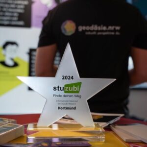 Auf der diesjährigen Stuzubi-Messe in Dortmund wurde die Kampagne geodäsie.nrw mit dem Stuzubi-Star ausgezeichnet. Die Besucher:innen der Messe entscheiden darüber, wo sie am besten informiert wurden, wer sie am freundlichsten beraten hat und welcher Messestand ihnen am besten gefallen hat. Auf dieser Grundlage wählen sie in ihrer Stadt jährlich den besten Messestand. Der Gewinner erhält den Stuzubi-Star. In Dortmund ging die Auszeichnung an die Kampagne geodäsie.nrw.